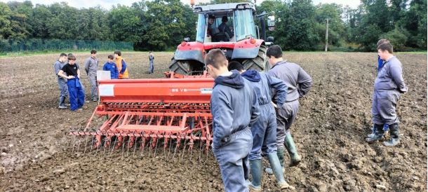 Enfin un petit rayon de soleil en ce vendredi après-midi. Il n'en fallait pas moins aux élèves de 2nde Agroéquipement pour sortir le combiné de semis. C'était l'occasion pour eux de mettre en pratique les réglages vus en classe et de réaliser plusieurs essais de débit. La culture implantée est un blé "Absalon".