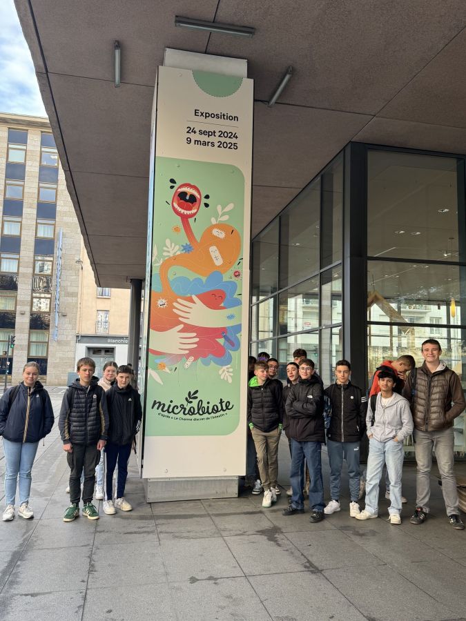 Journée Projet Sciences en 3ème A ! La classe s’est rendue en train à Rennes pour sa journée Sciences. Les élèves ont visité l’exposition « Microbiote » de l’Espace des Sciences. Une animatrice a présenté les étapes de la digestion dans le corps humain en précisant le rôle du microbiote. De quoi faire réfléchir à son alimentation ! Et que de bactéries : 40 000 milliards dans notre ventre